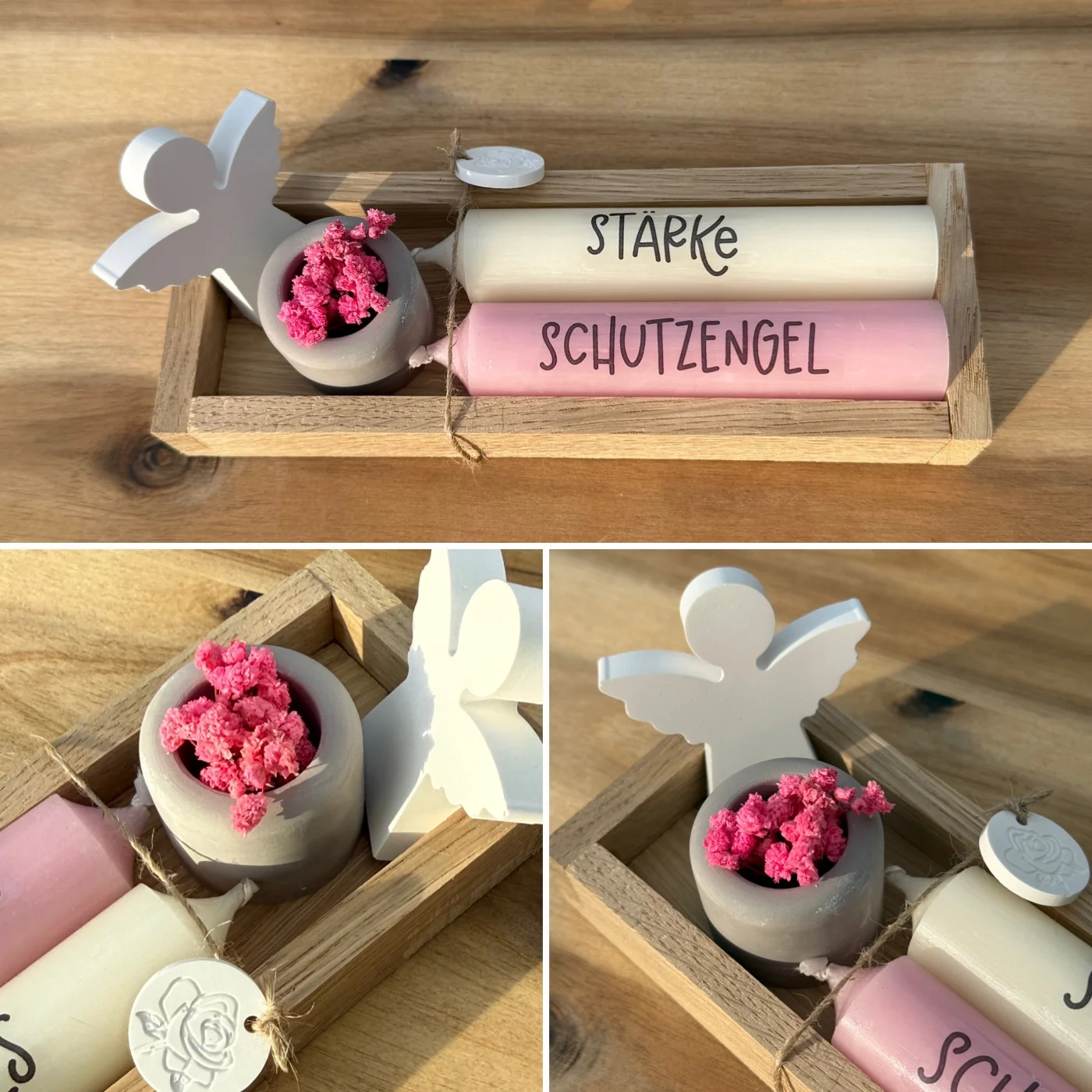 Jeder von uns braucht immer mal wieder einen kleinen Schutzengel – einen, der auf Dich aufpasst und da ist, wenn Du ihn brauchst. Darum ist dieses kleine Geschenkset auch so schön – denn es braucht gar keinen besonderen Anlass, um damit jemanden glücklich zu machen. Das handgefertigte Holzkästchen enthält nicht nur die beiden Kerzen (pastellaltrosa und elfenbein) mit den Aufdrucken „Stärke“ und „Schutzengel“, sondern auch einen taupe-grau-farbenen Kerzenhalter sowie einen kleinen Schutzengel zum Hinstellen. Zauberhaft und mit viel Liebe zum Detail für Dich kreiert – mit kleinem Anhänger und Trockenblumen.